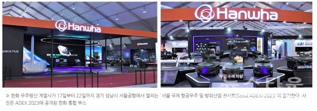 한화에어로스페이스, 한화시스템, 한화오션 등 우주·방산 계열사는 17~ 22일까지 경기도 성남 서울공항에서 열리는 ‘서울 국제항공우주 및 방위산업 전시회(ADEX) 2023’에 역대 최대 규모인 1140 ㎡의 통합부스를 운영한다고 16일 밝혔다. 이번 전시회는 34개국 550개 방산업체가 참가해 2009년 첫 개최 이후 최대 규모로 열린다.