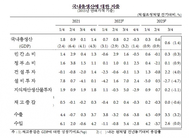한국은행은 26일 올해 3분기 실질 국내총생산(GDP) 성장률(속보치, 전분기 대비) 0.6%로 집계됐다고 밝혔다. 올 들어 3개 분기 연속적으로 플러스 성장을 하기 했지만, 4분기 성장률이 0.&%일 경우 연간 평균 성장률은 1.4%로 전망했다. 4분기 성장 전망은 이스라엘-팔레스타인 전쟁 등 중동사태와 국제유가의 동햐에 따라 변동될 것으로 보인다.