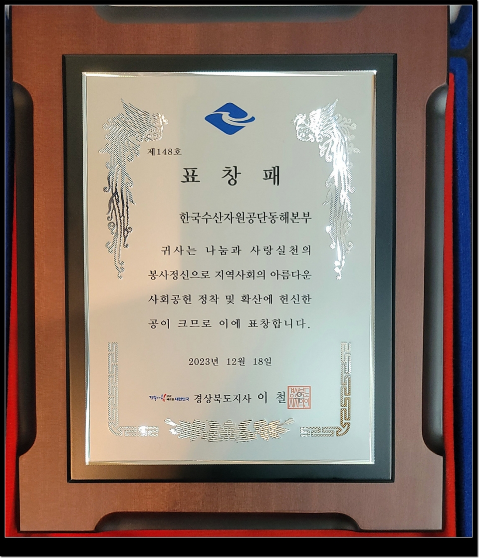 한국수산자원공단(이사장 이춘우) 동해본부(본부장 최성균)는 지역 상생발전을 위한 노력을 인정받아 2023년 지역사회공헌 인정기관으로 선정되는 영예를 안고 경북도지사 표창을 수상했다.