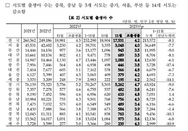 인구 1000명 당 출생아 수를 나타내는 조(組)출생률은 2023년 11월 4.2명으로 1년 전보다 0.3명 줄어들었다.