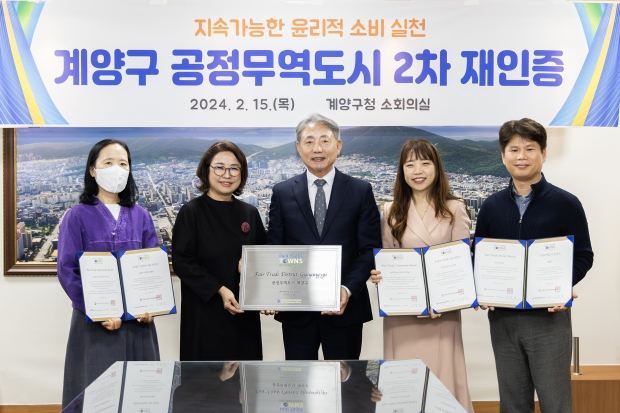 구는 지난 1월 20일 한국공정무역마을위원회로부터 공정무역도시로 재인증을 받았으며, 2월 15일 계양구청 소회의실에서 인증서와 현판 전달식이 진행됐다.