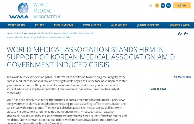 세계의사회(WMA)는 지난 1일 홈페이지에 '세계의사회는 한국 정부가 초래한 위기에서 대한의사협회를 강하게 지지한다'는 제목으로 입장문을 냈다. WMA는 "정부의 의과대학 입학 정원을 대폭 증가시키는 일방적 결정은 명확한 근거 없이 이루어졌으며, 의료 커뮤니티 내 혼란을 초래했다"며, "WMA는 한국 상황을 면밀히 모니터링하며 지속적인 업데이트를 받고 있다"고 밝혔다.