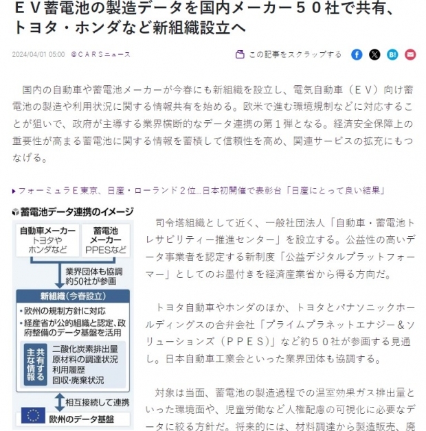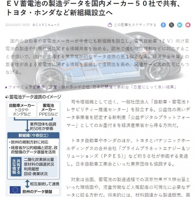 미국, 유럽 등지에서 진행되고 있는 환경규제 등에 대응하자는 것이 새로운 조직 설립의 목적이며, 일본 정부가 주도하는 업계 횡단적인 데이터 제휴의 1탄이다. 경제안전상의 중요서이 높아지고 있는 배터리에 관한 정보를 축적하여 신뢰성을 높여, 관련 서비스의 확충하겠다는 포부이다.