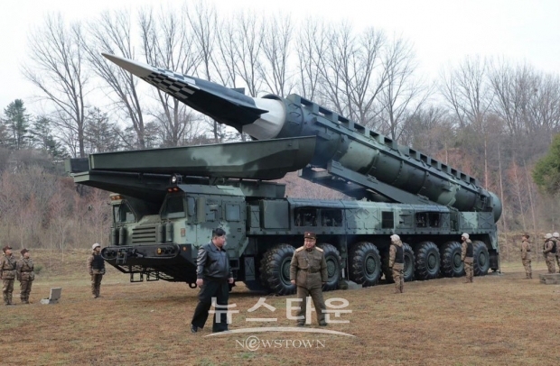 4월 2일 북한이 새로 개발한 극초음속 활공비행 전투부를 장착한 새형의 중장거리 고체탄도 미사일 '화성포-16나' 형의 첫 시험발사했다고 3일 보도/X, 조선중앙통신