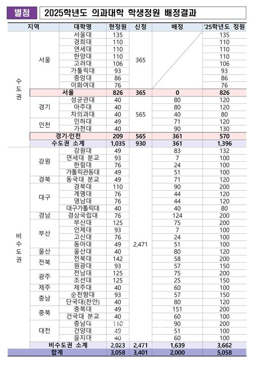 지난 3월 발표한 2025학년도 의과대학 학생정원 배정결과는 ▲강원대 현정원 49명에서 132명으로 ▲경북대 현정원 110명에서 200명으로 ▲경상국립대 현정원 76명에서 200명으로 ▲충남대 현정원 110명에서 200명으로 ▲충북대 현정원 49명에서 200명으로 ▲제주대 현정원 40명에서 100명으로 배정했다.