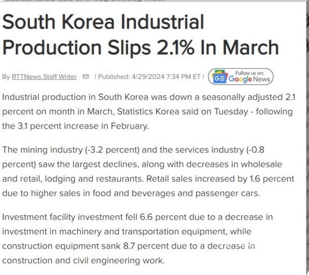 통계청은 지난 2월 3.1% 증가에 이어 3월 한국 공업생산이 계절적 요인을 감안해 전월 대비 2.1% 감소했다고 30일 밝혔다.