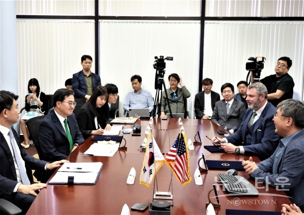 프리미엄아울렛 투자유치에 앞서 김 지사는 같은 장소에서 ㈜코스모이엔지 양기일 대표, 마이클 론델리 미국 노스텍사스대 처장, 최원봉 미국 노스텍사스대 교수, ㈜엠피에스 LA 박정민 지사장과 함께 ㈜코스모이엔지와 2차전지 신소재 생산·연구시설 설립에 따른 투자협약을 체결했다.