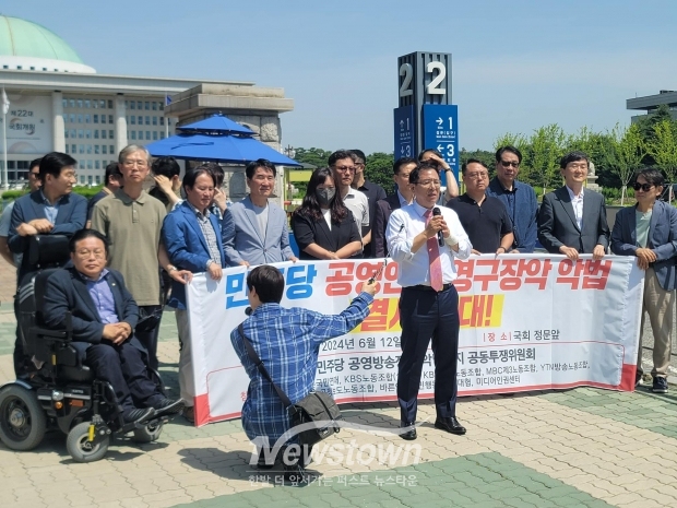 MBC 제3노동조합, 공정언론국민연대, KBS노동조합, YTN방송노동조합 등 9개 단체는 이날 오후 국회 앞에서 기자회을 열고 민주당이 추진하고 있는 방송3법 개정안은 "공영언론 영구장악 악법"이라며 "공영방송 이사회를 민주당 하부조직으로 만들고, 사장을 민주당 추종자로 만들겠다고 작정하지 않고서는 도저히 할 수 없는 뻔뻔한 발상"이라고 비판했다.
