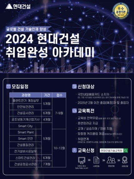 자세한 모집 정보는 현대건설 기술교육원 홈페이지와 매주 수요일 공식 유튜브 채널에서 진행하는 온라인 설명회에서 확인 가능하다.