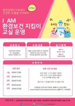 인천광역시는 환경보건에 취약한 초등학생을 대상으로 오는 8월 13일부터 8월 25일까지 ‘I AM 환경보건지킴이’ 교육을 실시한다.