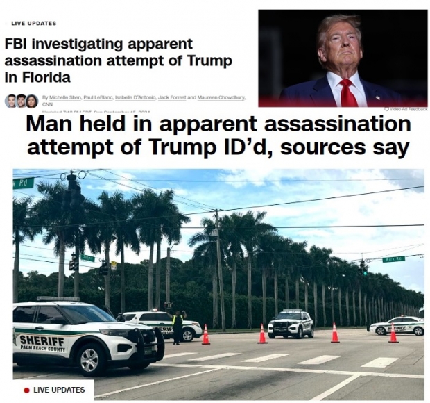 도널드 트럼프 미 공화당 대통령 후보가 15일 오후(현지시간) 플로리다주 본인 소유의 골프장에서 골프를 치던 중 어떤 남성에 의해 암살 시도로 보이는 사건이 발생, 올들어 두 번째 암살을 모면했다.