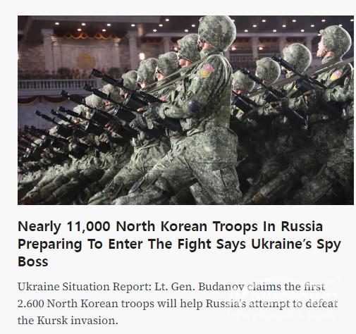 이 매체는 “우크라이나 국방부의 정보기관 '정보총국'은 17일 약 1만 1000명의 북한 병사들이 11월 1일까지 러시아 동부지역에서의 훈련을 완료하고, 처음 2600명이 러시아 서부 크루스크 주로 파견될 것”으로 전망했다.