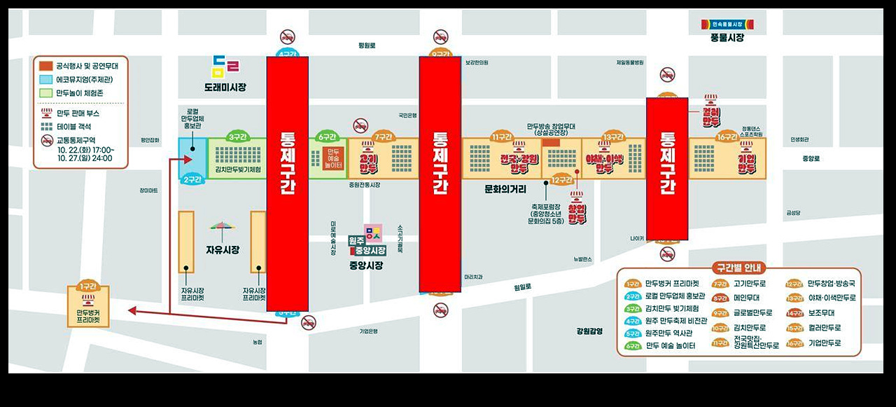10월 25일(금)부터 27일(일)까지 개최되는 ‘2024원주만두축제’의 주요 무대, 판매 부스 등의 설치를 위해 축제에 앞서 교통 통제를 미리 실시함으로써 보행자 및 차량 안전사고를 사전에 방지한다는 방침이다.