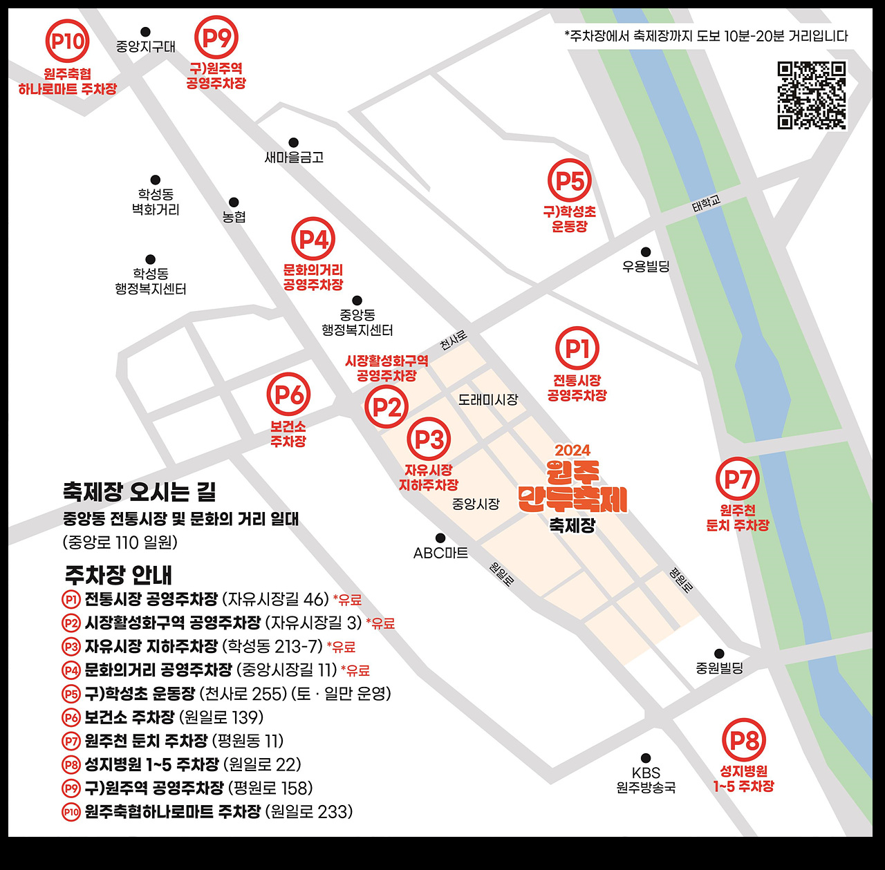특히 축제 방문객의 편의성 증진을 위해 ▲전통시장 공영주차장 ▲시장활성화구역 주차장 ▲자유시장 지하주차장 ▲문화의거리 공영주차장 ▲(구)학성초 운동장 ▲보건소 주차장 ▲원주천 둔치 주차장 ▲성지병원 1~5 주차장 ▲(구)원주역 공영주차장 ▲원주 축협하나로마트 야외주차장 등 임시주차장 10개소를 운영한다.