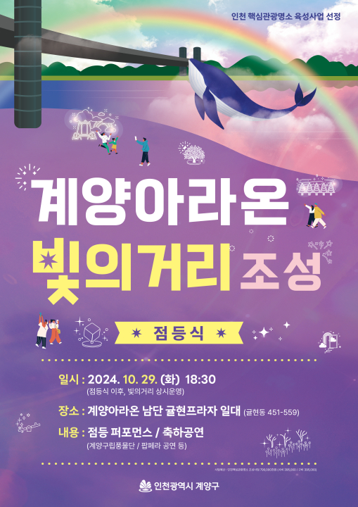 ‘계양아라온 빛의거리’는 인천시 주관 핵심관광명소 육성 공모사업에 계양구가 선정돼 추진하는 사업이다. 구는 계양아라온 관광 활성화를 역점사업으로 추진하며, 지난해 계양대교 북단 황어광장부터 수향원 일원에 이르는 구간을 ‘빛의거리’로 조성했다. 올해는 계양역에서 도보 5분 거리로 접근성이 더욱 뛰어난 계양아라온 남단 구간에 ‘빛의거리’를 조성하는 2단계 사업을 추진했다.