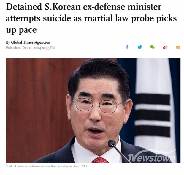 윤석열(대통령)의 비상 계엄령 선포와 관련, 첫 번째로 구속된 한국의 전 국방장관 김용현이 수사 속도가 빨라지고 있는 가운데, ‘자살 시도’를 했다고 중국의 ‘글로벌 타임스’(GT)가 논평없이 11일 보도했다.