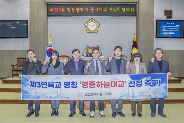 인천 중구의회(의장 이종호)는 지난 12월 11일, 제3연륙교 명칭과 관련해 중구민의 의견을 반영한 ‘영종하늘대교’를 공식 명칭으로 확정할 것을 강력히 촉구하는 결의문을 발표했다.