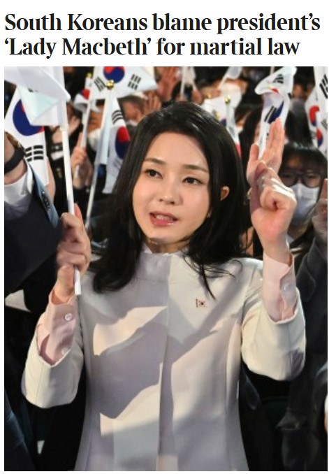 신문은 16일 “한국인들은 대통령의 ‘레이디 맥베스(Lady Macbeth)’를 계엄령 선포 이유로 보고 있다”(South Koreans blame president’s ‘Lady Macbeth’ for martial law)라는 제목의 기사를 통해 김건희에 대한 일반 대중의 시각을 해석했다.