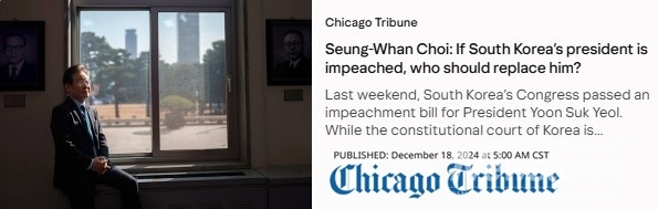 한국 헌법재판소는 180일 이내에 최종 판결을 내릴 것으로 예상되지만, 비상 계엄령을 선포하고, 여론이 좋지 않아 대통령에게 유리하지 않을 가능성이 크며, 헌법재판소의 판결에 따라, 한국 국민은 60일 안에 다음 대통령을 선출해야 한다고 미 일리노이즈 시카고대학에서 한국 정치와 국제 관계를 가르치는 최승환 교수가 시카고 트리뷴지 기고의 글에서 이같이 말했다.