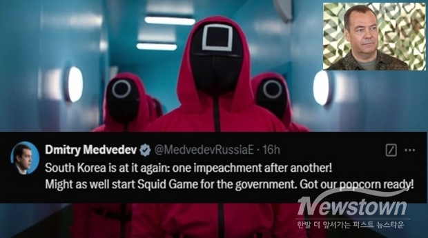 드미트리 메드베데프(Dmitry Medvedev) 러시아 안전보장이사회 부의장은 최근 한국 정치권에서 발생하고 있는 연이은 탄핵과 관련, 탄핵을 해도 변하지 않는다는 것을 빗대여 “한국 정부판 오징어 게임”이라고 조롱하고, 이 게임을 즐기는데 필요한 ‘팝콘’은 준비돼 있다고 비아냥거렸다.