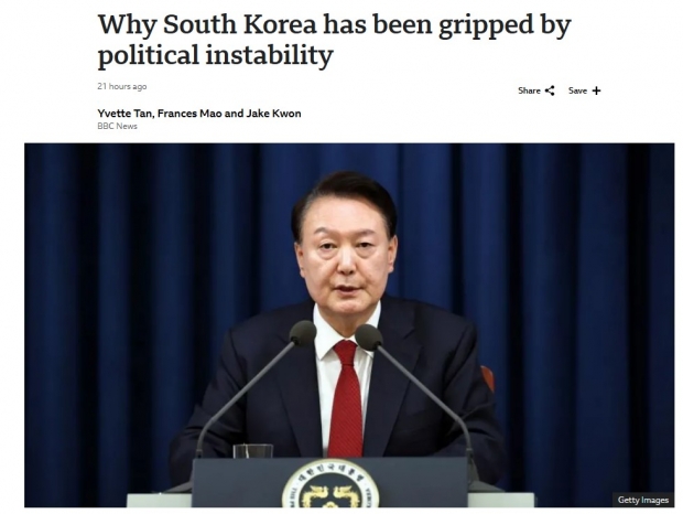 영국의 BBC 뉴스는 27(현지시간) 이같이 한국의 정치적 불안의 시발점을 설명했다. 반국가세력이나 북한의 위협이 아니라 자신이 곤경에 처한 정치적 난제를 풀어내겠다며, 있어서는 안 될 비상계엄령(martial law)을 선포했다는 뜻이다.
