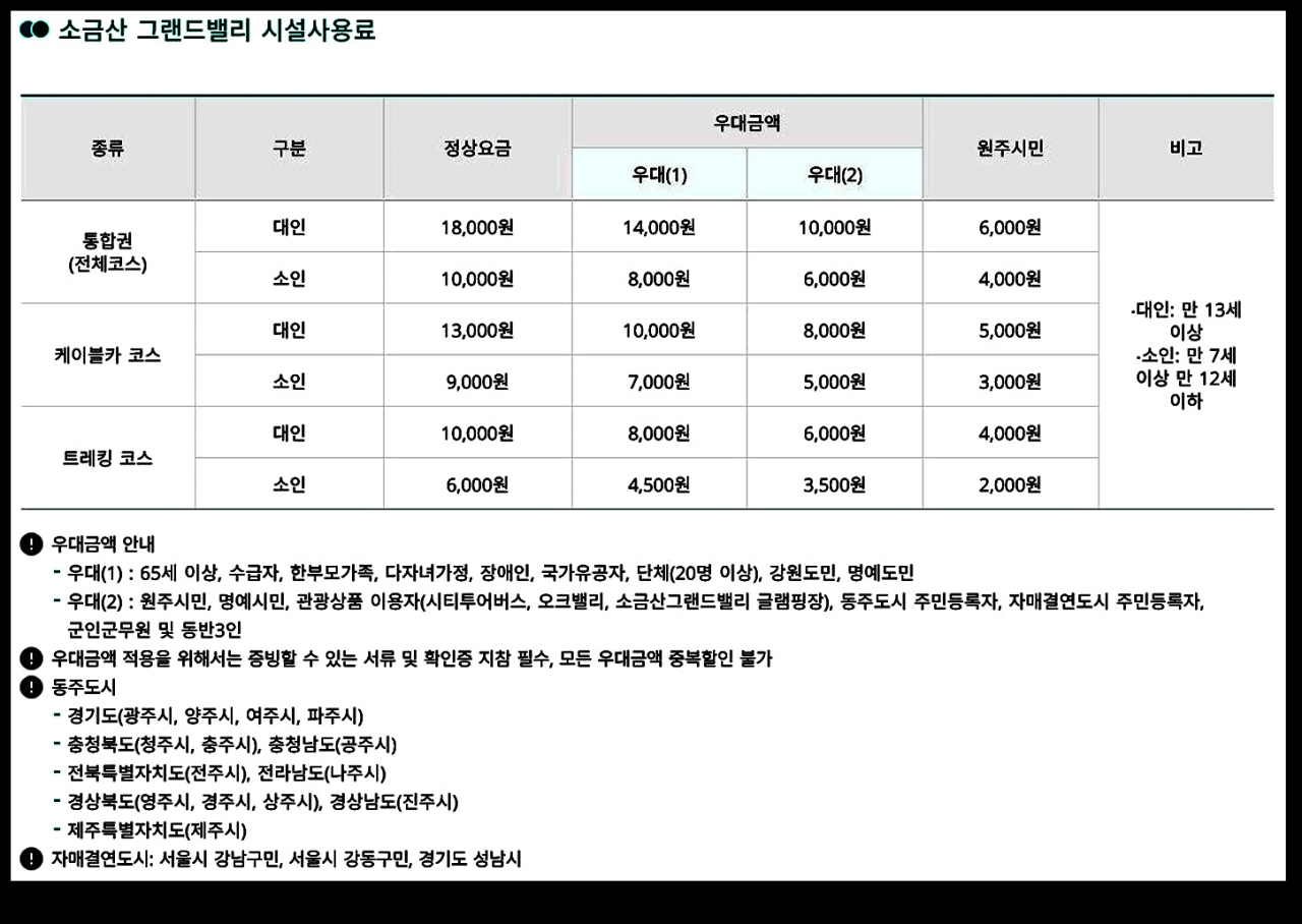 시설사용료는 소금산 그랜드밸리 전체코스 통합권 대인 기준으로 18,000원이며, 원주시민은 6,000원에 이용할 수 있다.