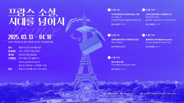 이번 프로그램은 프랑스 문학에 관심 있는 성인이라면 누구나 참여할 수 있으며 28일 오후 2시부터 연수구립도서관 누리집에서 선착순으로 신청할 수 있다.