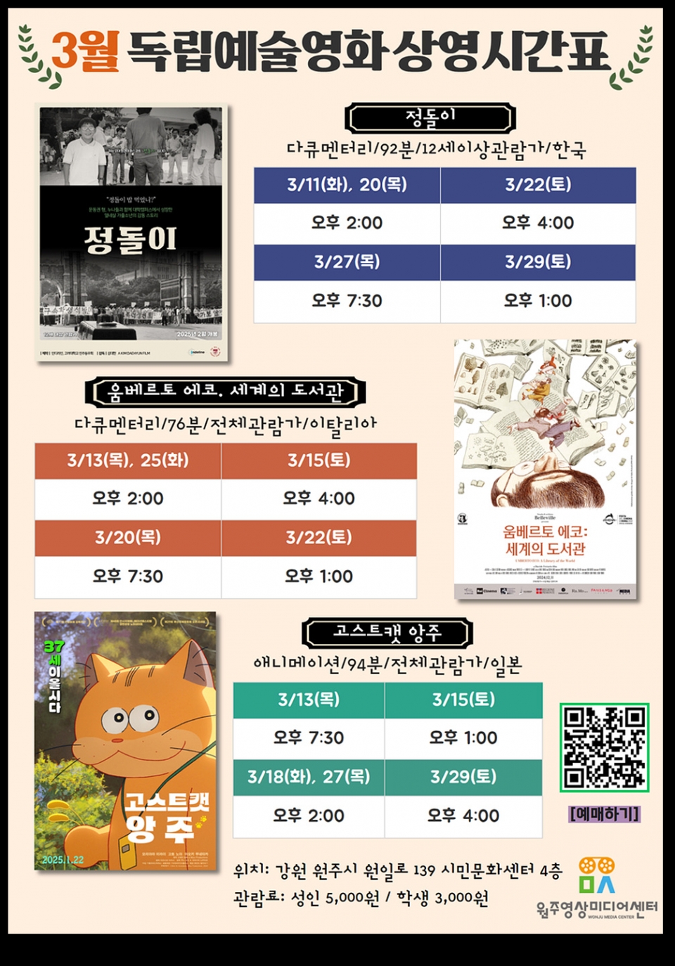 상영작 정보 확인 및 사전 예매는 원주시 통합예약플랫폼 또는 네이버 예약을 통해 진행할 수 있다. 결제는 현장에서만 진행되며, 관람료는 일반 5천 원, 청소년 3천 원이다.