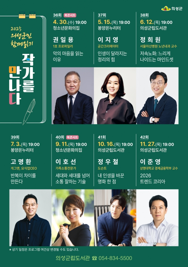 이번 프로그램은 연말까지 총 7회에 걸쳐 각 분야의 저명한 작가들과 함께 이어진다. 5월에는 정리 전문가 이지영의 ‘정리의 힘’, 6월에는 정희원 교수의 ‘저속노화 마인드셋’, 7월에는 방송인 고명환의 ‘반복의 차이’ 강연이 준비되어 있다. 이어 하반기에는 소통 전문가 이호선(9월), 도슨트 정우철(10월), 트렌드 전문가 이준영(11월) 작가가 차례로 의성을 찾아 군민들의 인문학적 소양을 채워줄 예정이다.