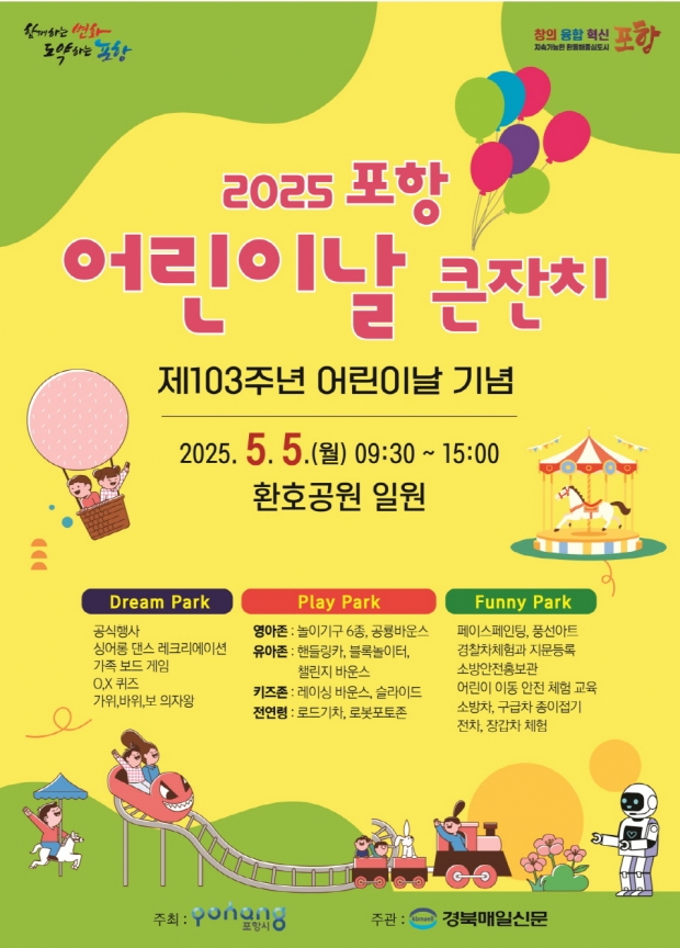 포항시가 제103회 어린이날을 기념해 오는 5일 환호공원 일원에서 2025 포항 어린이날 큰잔치를 개최한다. 시가 주출하고 경북매일신문사가 주관하는 이번 행사는 지역 아동들에게 특별한 추억을 선사하기 위해 다채로운 체험과 놀이 프로그램을 중심으로 구성됐다. 행사장 특설무대에서는 식전 공연과 기념식을 시작으로 온 가족이 참여하는 레크리에이션과 가족 미니 운동회인 드림 파크가 차례로 펼쳐진다.