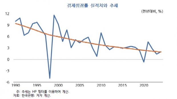 이어 보고서 분석은 “올해 잠재성장률은 1%대 후반으로 추정되며, 2040년대 후반에는 0% 내외까지 하락할 것으로 예상된다”면서 “인구구조 변화가 잠재성장률 하락의 가장 ‘큰 요인’”이라고 진단했다.