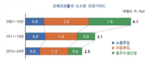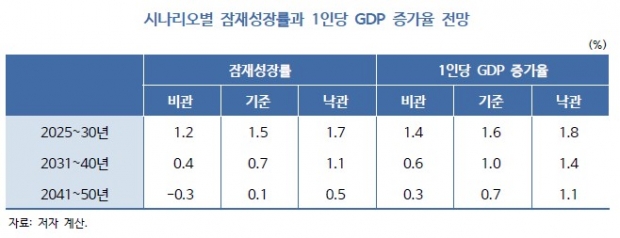 KDI 보고서는 또 총요소생산성 증가율을 기준 0.6%, 낙관 0.9%, 비관 0.3%의 세 시나리오로 설정해 잠재성장률과 1인당 국내총생산(GDP) 변화를 예측했는데, 기준 시나리오에서 잠재성장률은 2025∼2030년 1.5%, 2031∼2040년 0.7%, 2041∼2050년 0.1%로 점차 떨어질 것으로 예상됐다. 2040년부터는 기준 이하로 전환된다.