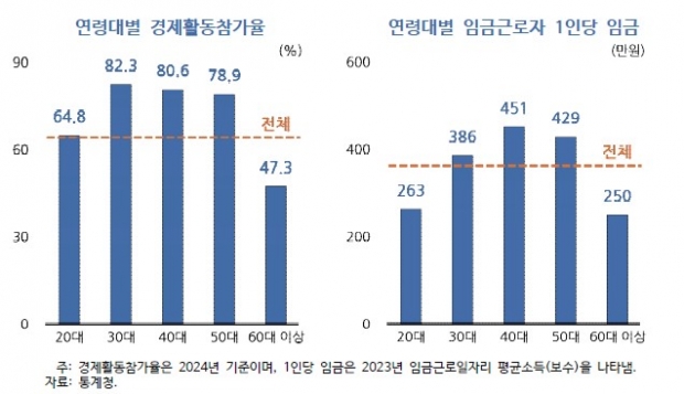 따라서 노동 투입 기여도는 2030년 전후 마이너스로 전환될 것이며, 고령층 증가로 생ㅅ6ᅟᅡᆫ성 자체도 낮아질 것으로 보고서는 분석했다. 실제로 60대 이상 임금 근로자의 평균 보수는 30∼50대보다 현저히 낮고, 경제활동참가율도 절반 수준에 불과하다.