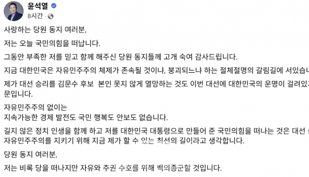 또한 윤 대통령은 “길지 않은 정치 인생을 함께 하고 저를 대한민국 대통령으로 만들어 준 국민의힘을 떠나는 것은 대선 승리와 자유민주주의를 지키기 위해 지금 제가 할 수 있는 최선의 길”이라며 “당원 동지 여러분, 저는 비록 당을 떠나지만 자유와 주권 수호를 위해 백의종군할 것”이라고 말했다.