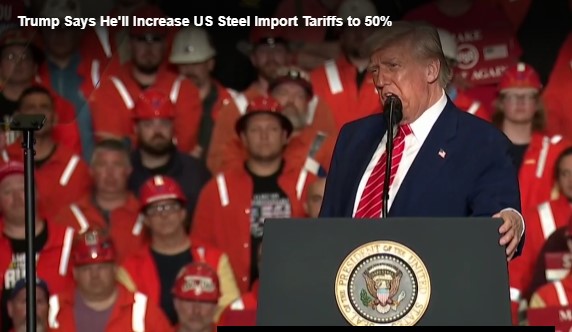 트럼프는 외국산 철강 수입품에 대한 관세를 50%로 인상할 계획이라고 밝혀, 글로벌 철강 생산업체에 대한 압박을 가중시키고, 무역 전쟁을 심화시키겠다고 다짐했다고 로이터 통신이 이날 보도했다.