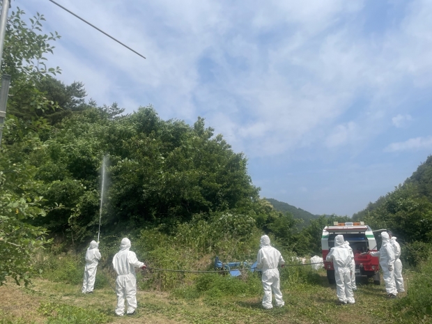 협업공동방제에는 농업기술센터, 산림과, 울진국유림관리소 및 농업인 등 20여 명이 참여하였으며, 광역방제기와 SS기, 인력방제 등을 활용해 산림 1ha, 농장 1ha에 집중 방제를 실시했다.