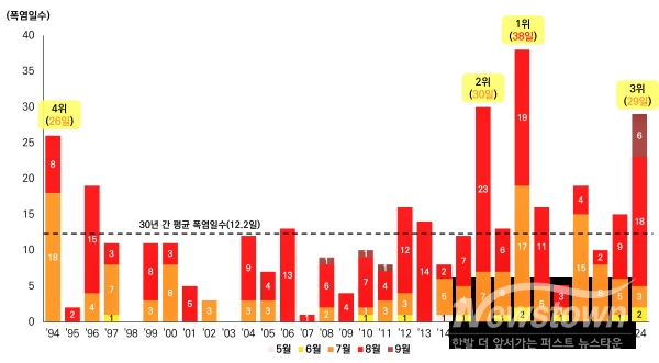 수원시 여름철 월별 폭염일수(1994~2024) /출처:기상자료개방포털 폭염일수 자료