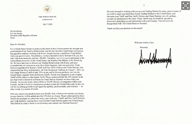 트럼프는 7일 자신 소유의 소셜미디어 트루스소셜(Truth Social)에 공개한 무역 관련 서한에서 “우리의 관계는 유감스럽게도 상호주의와 거리가 멀었다. 2025년 8월 1일부터 우리는 미국으로 보낸 모든 한국산 제품에 겨우 25%의 관세를 부과할 것이며, 이 관세는 모든 품목별 관세와 별도”라고 밝혔다. 이 서한은 이재명 대통령을 수신자로 지정했다.