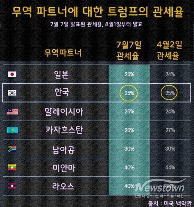한국에 부과하겠다는 관세율 25%는 트럼프 대통령이 지난 4월 2일 한국에 부과하겠다고 발표한 상호관세 25%와 동일한 수치이다.
