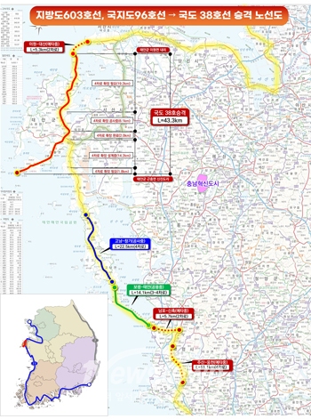 도는 지난 2021년 6월 이원∼대산 5.6㎞ 구간이 국도 38호로 지정된 이후, 지방도 603호와 국지도 96호 국도 승격을 지속적으로 건의하며 이번에 성과를 거뒀다.