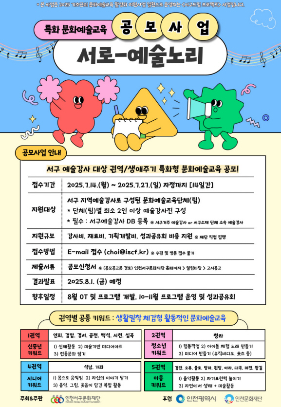 (재)인천서구문화재단 문화예술교육지원센터는 ‘2025 기초단위 문화예술교육 활성화 지원사업’의 일환으로 지역특화 문화예술교육 공모사업 <서로-예술노리>를 본격 추진한다.