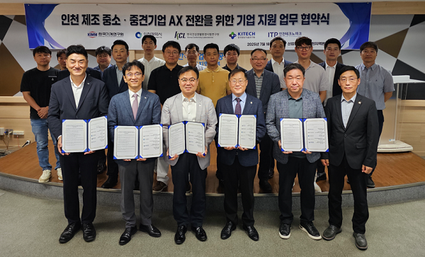 시는 7월 18일(금) 한국산업단지관리공단 인천지역본부에서 한국기계연구원(KIMM), 한국건설생활환경시험연구원(KCL), 한국생산기술연구원(KITECH), 인천테크노파크와 함께 중소·중견 제조기업의 인공지능 전환(AI Transformation) 지원을 위한 업무협약(MOU)을 체결했다.