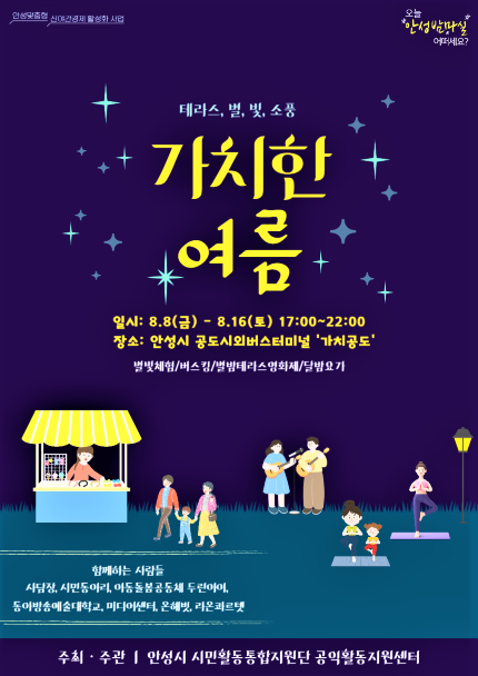 [뉴스타운/김병철 기자] 안성시는 오는 8월 8일부터 2주간에 걸쳐 금·토 야간 시간대(17:00~~21:00) 공도시외버스터미널과 가치공도(터미널 2층)에서 '가치한 여름ː테라스 별 빛 소풍' 행사를 개최한다.