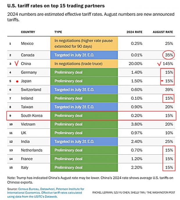 지난 7월 30일(현지시간) 트럼프는 브라질 상품과 수입 구리제품에 50%의 새로운 세금을 부과하고, 인도산 상품에는 25%의 세금을 부과한다고 발표했다. 그리고 팔레스타인에 대한 국가 승인을 시시한 캐나다에 대해서는 당초 25%에서 10%를 추가해 35%로 관세를 부과하겠다고 발표했다. 트럼프의 정치적 보복관세이다.