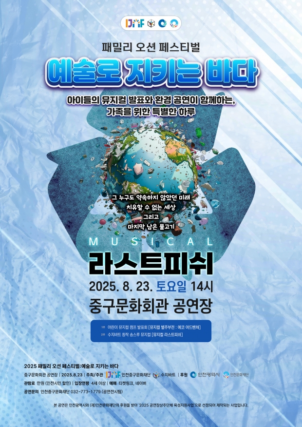 인천중구문화재단이 오는 8월 23일 오후 2시 중구문화회관에서 극단 ‘수지바트’의 창작 뮤지컬 라스트피쉬를 무대에 올린다. 이번 공연은 어린이와 성인 배우가 함께 참여해 환경 문제를 예술적으로 풀어낸다.