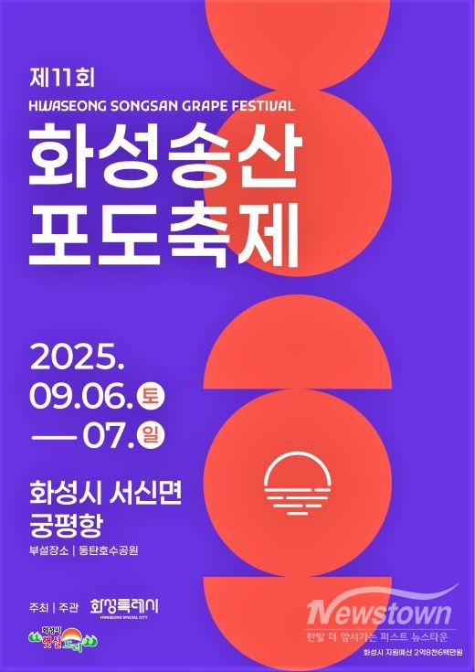 [뉴스타운/김병철 기자] 화성특례시가 오는 6일부터 7일까지 이틀간 서신면 궁평항에서 ‘제11회 화성송산포도축제’를 연다. 올해 축제는 시 대표축제로 격상되면서 규모가 대폭 확대됐으며, 농업·해양·문화를 아우르는 도농 교류형 축제로 기획됐다.