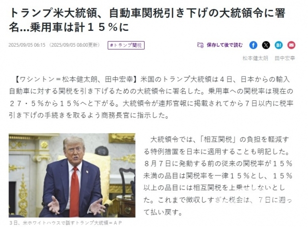 도널드 트럼프 미국 대통령은 4일(현지시간) 일본에서 수입한 자동차에 대한 관세를 인하하기 위한 행정명령에 서명했다. 승용차에 대한 관세율은 현재 27.5%에서 15%로 낮아진다. 행정명령이 연방관보에 게재된 지 7일 이내에 세율 인하 절차를 취하도록 상무장관에게 지시했다고 요미우리신문이 5일 보도했다.
