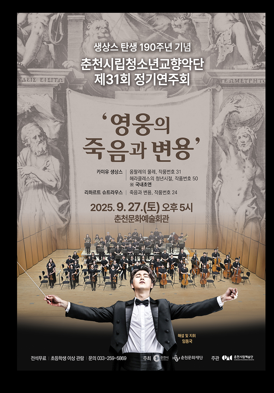 춘천시립청소년교향악단이 9월 27일 오후 5시 춘천문화예술회관에서 제31회 정기연주회 ‘영웅의 죽음과 변용’을 연다. 이번 공연은 프랑스 작곡가 카미유 생상스 탄생 190주년을 기념해 기획됐다.