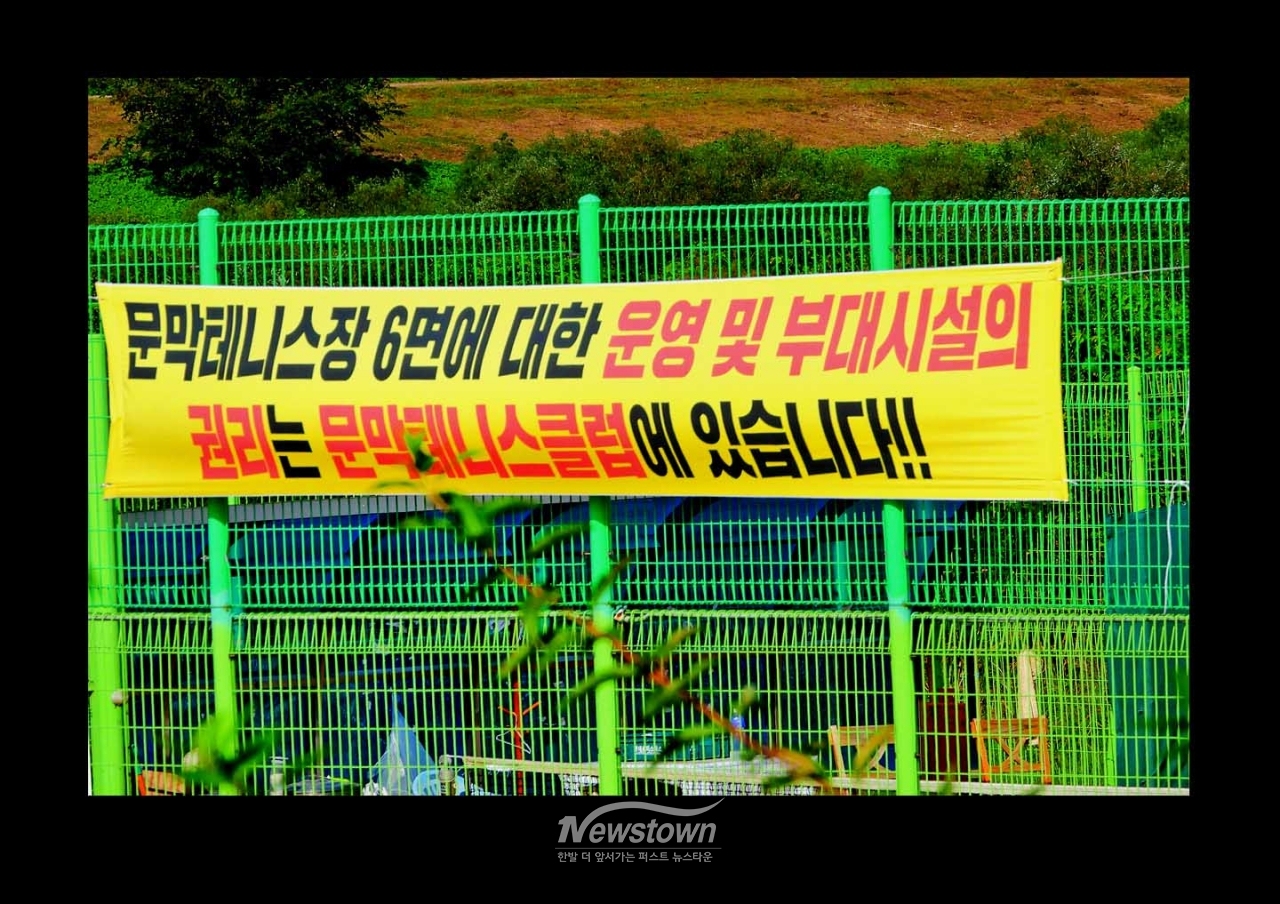 그런데 이런 소식을 접한 문막테니스동호회에서는 “문막테니스장 6면에 대한 운영 및 부대시설의 권리는 문막테니스클럽에 있습니다”라는 권리를 주장하는 현수막을 3곳에 내붙였다.