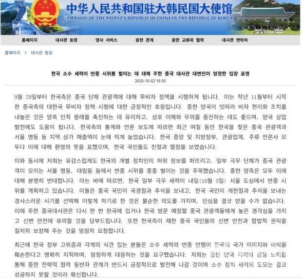 대사관은 2일에 웹사이트에 게시한 성명에서 “3일에 서울 시내의 특정 장소에서 집회가 예정되어 있다”고 경고했다. 성명서는 “우리는 일부 한국 정치인들이 허위 정보를 퍼뜨리고, 일부 극우 단체가 중국인 관광객들이 모이는 서울 명동과 대림동과 같은 지역에서 주기적으로 반중 시위를 벌인 것을 유감스럽게 생각한다”고 밝혔다.
